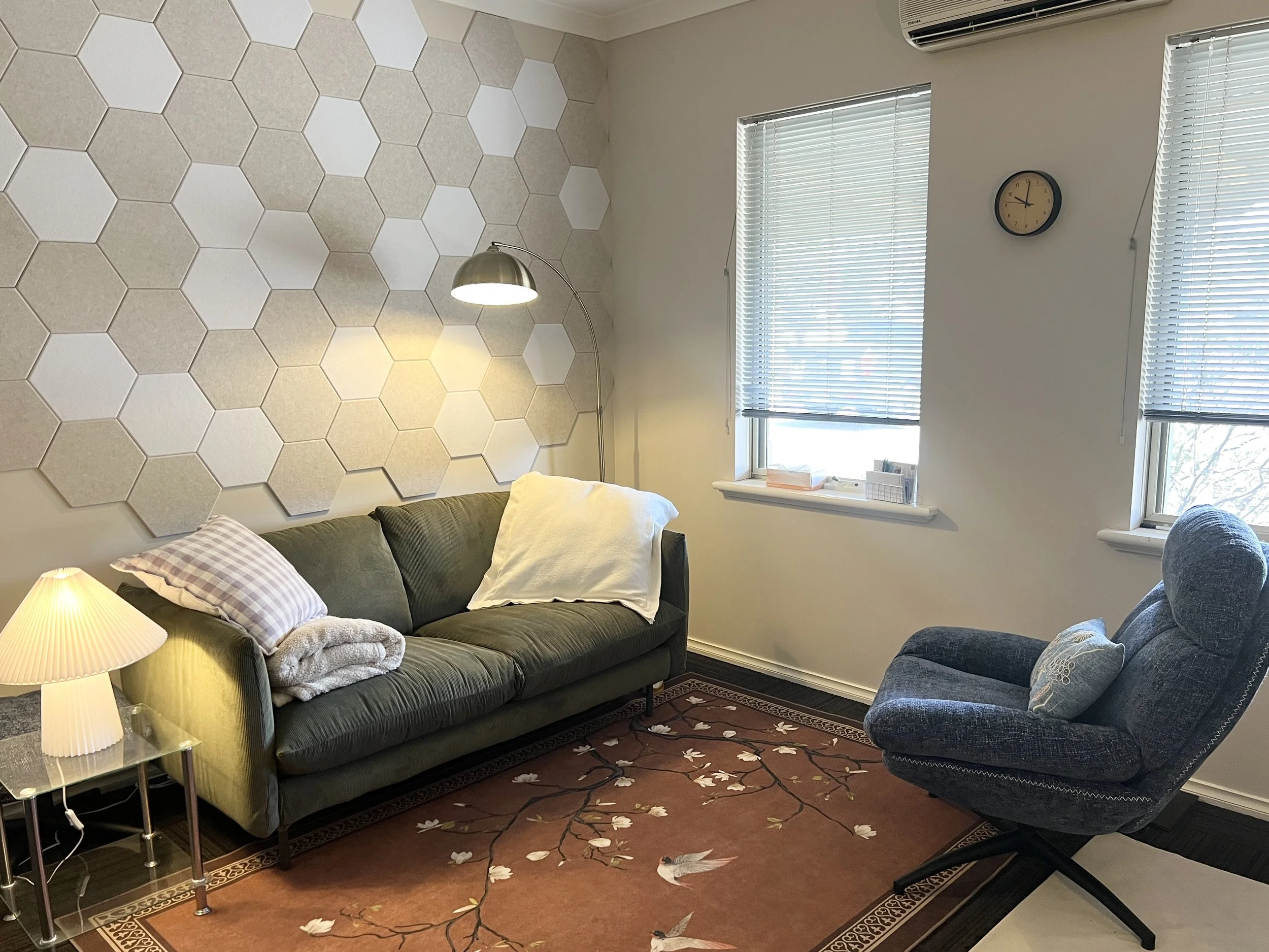 The therapy space is intentionally designed to feel welcoming, comfortable and human. Natural light fills the space during the day, and warm lamps offer softer lighting for anyone who finds overhead lights a bit too much. Colour is woven throughout — for kids, who often express and regulate through play and creativity, and for adults who want something that feels less clinical and more calming.